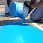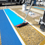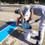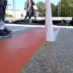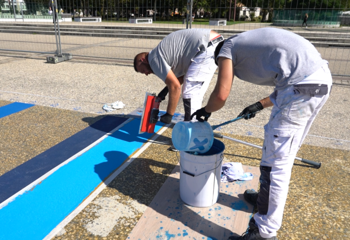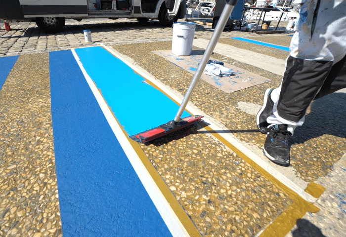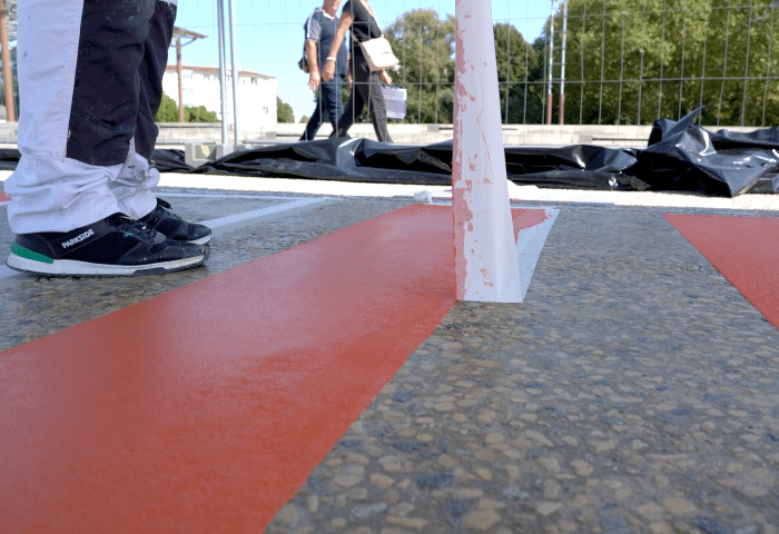 - en appliquant un système en 2 couches de résines de la gamme Triflex a base de PMMA (Polyméthyl Méthacrylate) apportant de nombreux avantages (Teintes sur-mesure, Solidité et résistance dans le temps, Application lissée au couteau, Temps de séchage rapide des bandes, Système réactivable permettant de réparer dans le temps n’importe quelle partie abîmée de l’ouvrage).